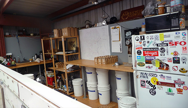 Another bit of awesome…Mission Workshop lends part of their shop out to a local SF company called Bicycle Coffee. This small area is Bicycle Coffee’s official HQ. I’m told they happily allow them to use this space for free because they have amazing coffee (and I imagine it would be free for the MW staff) and “it brings a fresh energy into the shop”. The energy being both figurative and literal. Their pitch is “we love good coffee and we really like to ride bicycles, so we decided to combine the two. It’s pretty simple, we roast quality coffee in our custom built roaster and deliver it by bicycle. We only roast organic, fair-trade, Arabica beans grown by farm cooperatives.”