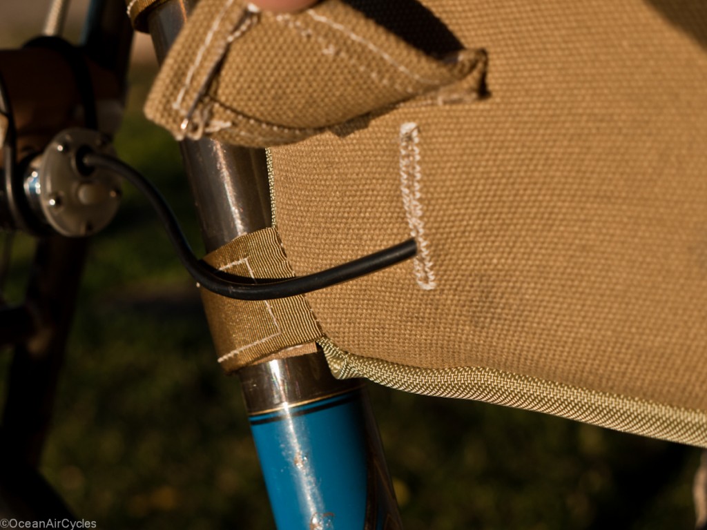 Bag Specifications: Frame bag with No.8 Canvas duck side panels, Jr Ballistic perimeter strip for abrasion resistance, multi point reinforced hook and loop connections, waterproof zipper with double pull and storm flap. Port for rear tail light battery wire.
