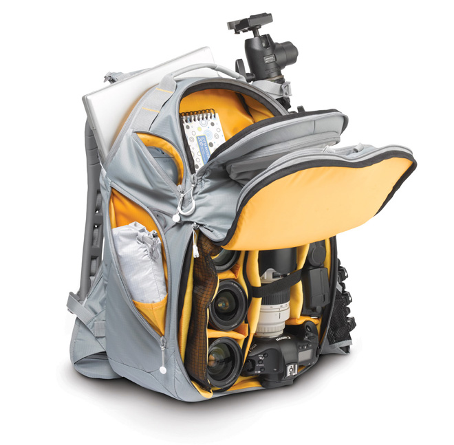 The rest of the pack’s features are generally well thought out: it just fits within most airlines’ carry-on dimensions, it has three different tripod holding options for different sizes of tripods, the outer stretch pocket inevitably gets used as a water-bottle holder so they’ve made it breathable and quick drying, the foam dividers in the camera compartment have holes in them to save weight, et cetera…