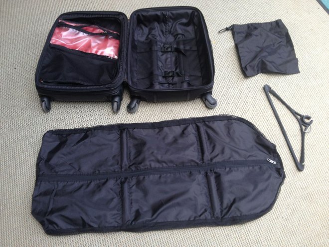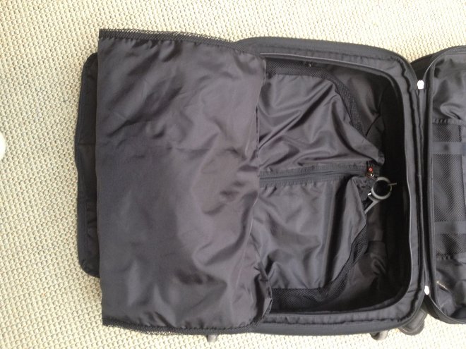 The second thing is the suits compartment. The bag comes with a suit hanger and a suit pack, part nylon, part mesh, that can be attached to a hook in the suit part of the bag. All really nicely done and carry-geek-worthy. However, I carried a suit and shirts several times and they always came out wrinkled. The suit pack is just too small in width to keep a suit tidy, and I’m a size 48. I guess it’s possible to bring one suit and fold the shirts separate from the suit pack, but that still doesn’t live up to my expectations.